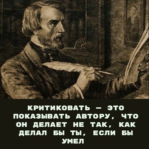 Критиковать — это не значит, что ругать, как многие понимают. Критиковать — это высказать своё отношение к явлению, и оно вовсе не обязательно бывает такое, что автору следует обижаться. Критик — это не тот неудачник, который сам не умеет, главное — он умеет писать: в этом его профессиональная работа и одновременно — его, критика, искусство.
