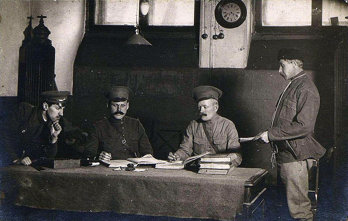 Иллюстрация: 1920-е годы. Москва, улица Малые Каменщики, дом 16. Московская губернская уголовная тюрьма («Таганка»). Заседание революционного трибунала. Примерно так же выглядела работа чекистов в январе - сентябре 1918 года и заседания трибуналов ЧК в 1918 году.