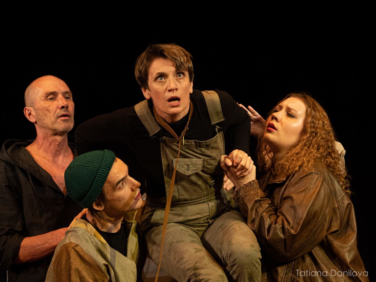 Исполнители ролей не играют голосом - голосом они все скорее читают текст как литературный, пропевают его как балладу или эпос, а вот образы своих персонажей они создают проживая их жизнь - телом, глазами, мимикой; страхом, нежностью, жаждой. Озвучивая текст они как бы остаются сторонними наблюдателями, свидетелями, исследователями, изучающими предложенные обстоятельства и фиксирующими происходящее, в то время как глаза, мимика зеркалят иное: душа - она больше материального мира; их проживание настолько ярко, что, кажется, душа рвётся наружу. При этом в постановке каждый персонаж оживает не только усилиями его исполнителя, но и весь ансамбль поочерёдно для каждого становится “свитой” и “делает короля”.