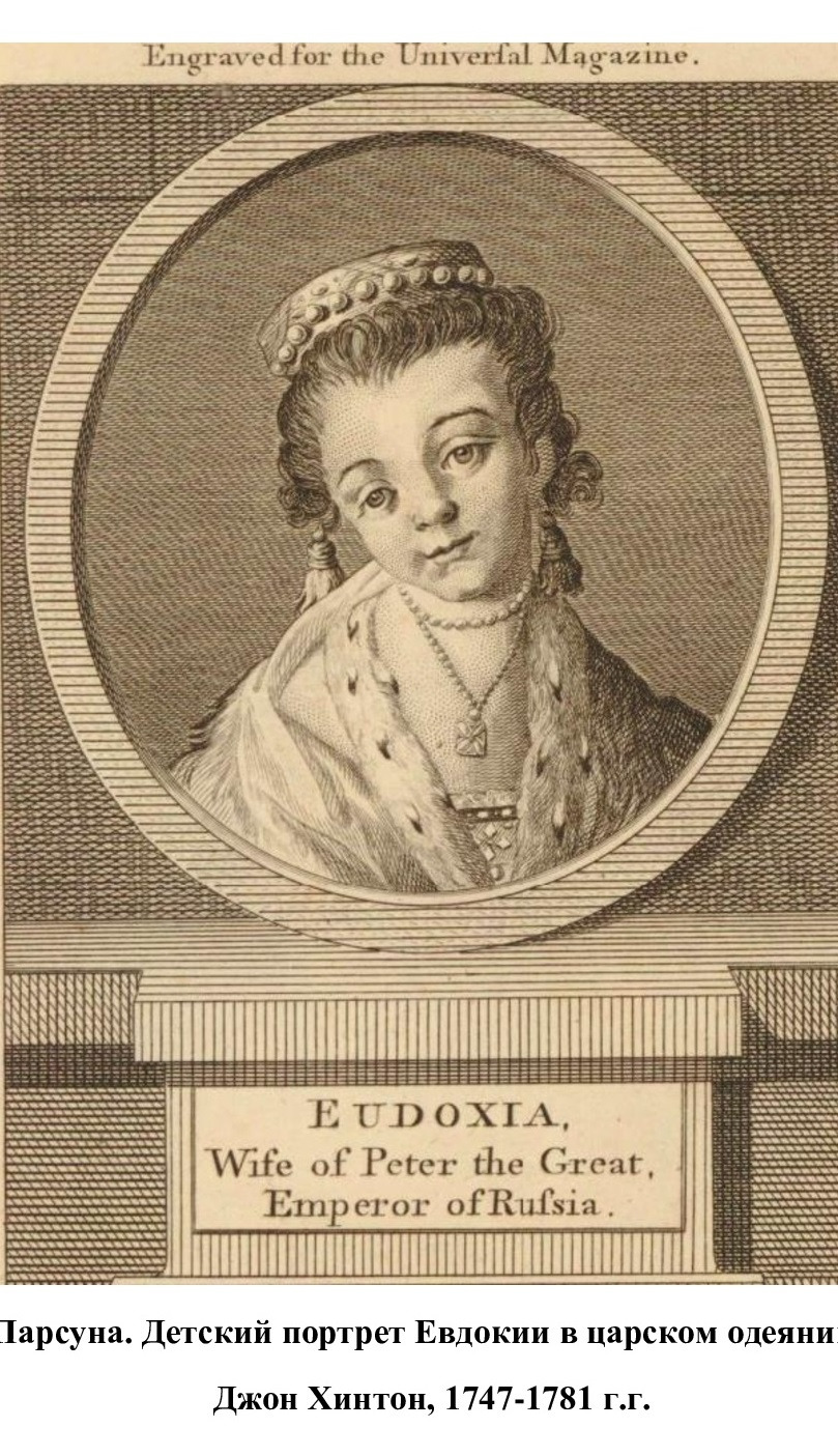 АВТОР. Мои попытки обнаружить хоть какую-нибудь информацию о физических параметрах Евдокии не увенчались успехом, да и не многочисленные ее портреты выполнены в основном в виде: погрудного либо попоясного формата. Нет ни одного ростового из которого можно было бы сделать представление о ее, хотя бы, росте. Проблема была даже в выборе иллюстрации. Все известные портреты написаны неизвестными художниками в стиле примитивизма. Единственная картина, которая мне показалась забавной – это парсуна с детским изображением Евдокии, почему-то в царском одеянии. Парсуна — ранний жанр портрета в Русском царстве, переходный между иконописным изображением людей и светским портретом. Особенности парсуны: портретное сходство передаётся условно. Согласно описанию, автор изображения — Джон Хинтон, работа создана для лондонского журнала «Universal Magazine» в период между 1747 и 1781 годами. Ясно, что это авторская фантазия на тему, но хотя бы более-менее одушевленная.