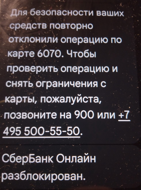 Иду в банкомат, вставляю карту, набираю сумму, о оттуда -КУКИШ! Карта заблокирована. Я к оператору. Она посмотрела, говорит, Вам прислал банк СМС. Читайте. Просят позвонить по номеру 900. Звоню...Отвечает молодой человек, говорит, что система заметила подозрительную операцию и заблокировала карту.Спрашиваю, что моя физиономия Банкомату не понравилась?Это раньше я был молодой и красивый, а теперь только красивый! Деньги мои отдай! И тут началось. А почему Вы снимаете всю сумму, Вас никто не заставляет? Отвечаю, мои деньги, сколько хочу, столько и снимаю! А вот мошенники сейчас обманываю людей, мы Вас должны обезопасить! Вас ещё не пытались обмануть? Говорю, да. Пытались. Спрашивает, а как? Отвечаю, хотели узнать цифры с обратной стороны банковской карты. И вы сказали? Я - да. Сказал, что у меня не цифры, а заморские буквы. Пиши! "ИКС", потом "ИГРЕК" и "ЗЭТ", правда перевёрнутая и кавычка сверху. Больше мне они не звонили. Но товарищ не понял и минут двадцать читал мне лекцию и злодеях. Не о злодЕях, а о злОдеях. Я понимаю, что это его работа, да и правильно делает. Таких случаев обмана много. Так что пока он мне втолковывал азы безопасности, я сходил в магазин, закупился и пришёл получить свои кровные...Во как!