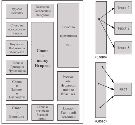 Более редка в «Слове» отсылка другого рода – когда из одной фразы «Слова» автор отсылает читателя сразу к нескольким различным текстам (см. рис.).