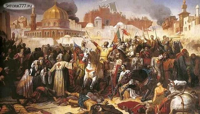 А вот как историки описывают взятие христианами Иерусалима, который защищали мусульмане и православные христиане. Обещая сдавшимся мусульманам, защищавшим город, сохранить жизнь, христиане вырезали всех, кто сложил оружие, включая мирных жителей, многие из которых были православными христианами. По христианской традиции воины с крестами на щитах и одежде, вырезали население всех городов, в которых население оказывали сопротивление их грабежу.
