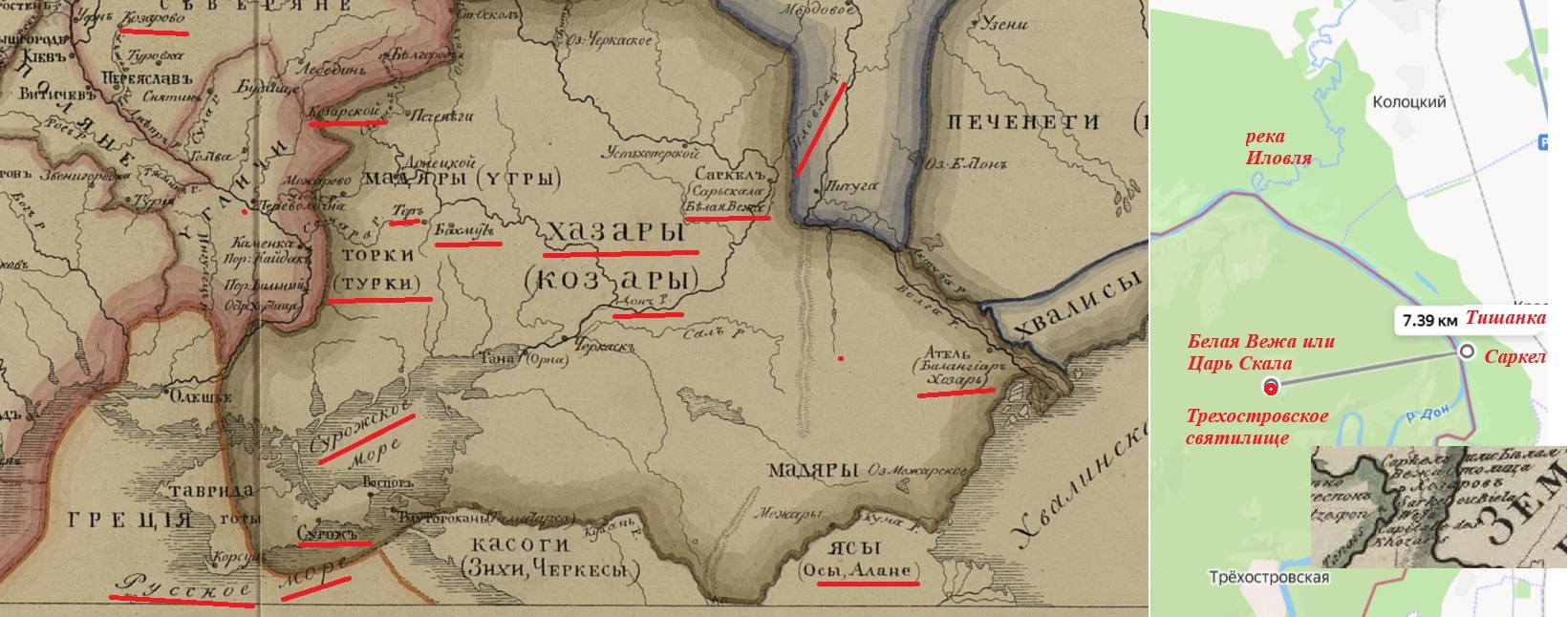 На карте из коллекции РНБ «География Константина Багрянородного в 946 году по Р.Х.» можно увидеть надпись: «Саркел или Белая Вежа Столица Хозаров» и место этого города – на ЛЕВОМ берегу Дона, как раз напротив нашего Трехостровского святилища!