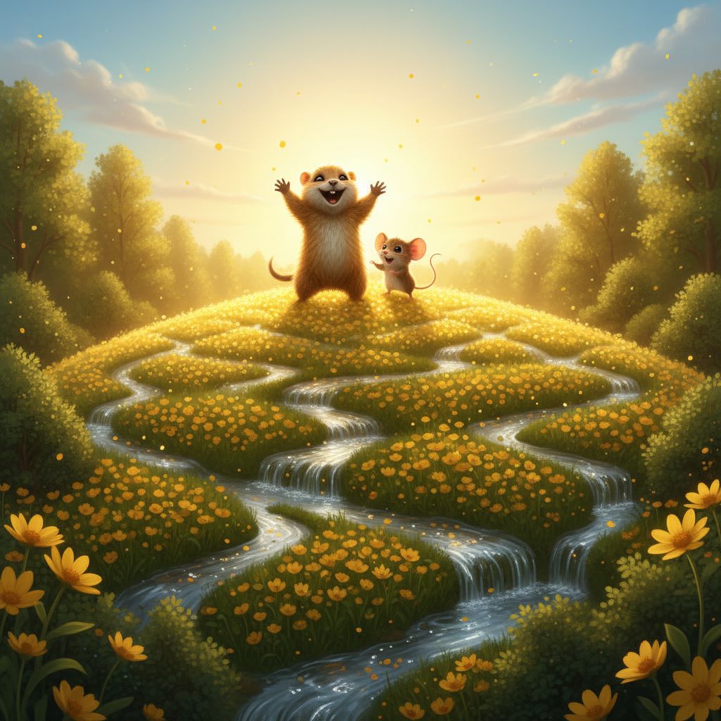 День клонится к вечеру, когда впереди показалась гора, покрытая золотистыми цветами. Уже с подножия доносился тёплый медовый запах. Друзья поднялись наверх и увидели: по склонам действительно журчат кристально чистые ручьи, а в воздухе вьются весёлые пчёлы. На самой вершине Лим нашёл родничок — вода была сладковатая и очень освежающая.