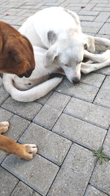 Проснулся, всё хорошо. Вчера завёл собаку. Она девочка, назвал Рэсси, как в фильме про "Электроника". Перед возвращением сделаю ей паспорт и прививки, чтобы можно было с собой взять. Она очаровашка. Люди сказали, что ей года четыре. Постараюсь в скором времени прислать её фотки в телеграм. Обрати внимание на наглую рыжую лапу в нижнем левом углу фотографии. Это мы с моей лапочкой ночевали у фонтана на вершине горы, где находится главная телевышка города Сухум. А сутра это рыжее чудо-юдо выскочило с охраняемой территории телевышки и стало с ней играться. Естественно такие игры быстро надоели моей белокурой красотке и она прилегла отдохнуть. Однако нерадивый кавалер никак не унимался. Знаешь, я вообще не понимаю этих безродных кобелей. И моя прелестулька, по-моему тоже. Где она и где они? Небо и земля. Шансов у всей этой безродной братии - ноль на палочке. Ей нужен другой - и все мы, я надеюсь, это прекрасно понимаем. Ты согласна, верная супруга моя? Люблю, крепко прижимаю к себе - твой нежный пёсик.