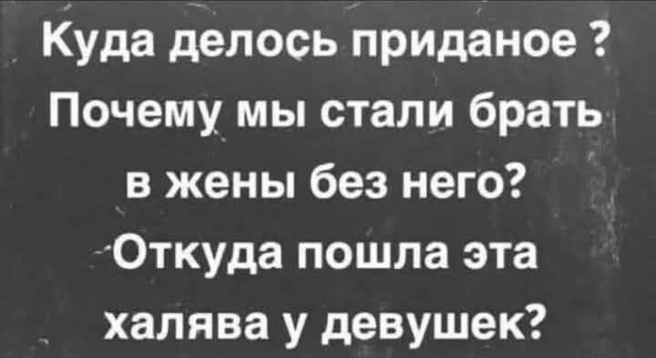 С таким приданным только за киргизского дворника выйдешь!.. Ныне девки в приданное берут айфон 17 про макс, пару флакончиков французских духов шанель 5, эллиптический тренажер и шведскую стенку!..