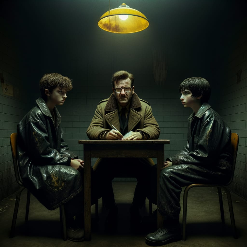 Следователь, пытаясь сохранить хоть какую-то стойкость, усмехнулся, не зная, как реагировать на подобную жуть. Он не мог даже понять, что в этих детях было настолько неправильного. Всё происходящее с ними казалось ненормальным, и в его усталых глазах это лишь подтверждало абсурдность происходящего.