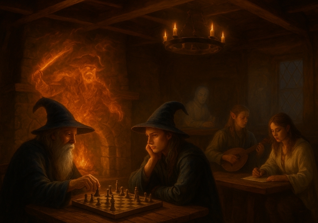 За одним из столов, за шахматной доской из обсидиана, сидели двое. Один - старик с темными глазами. Другой - молодой парень, его пальцы искрили, отчего в воздухе пахло озоном.