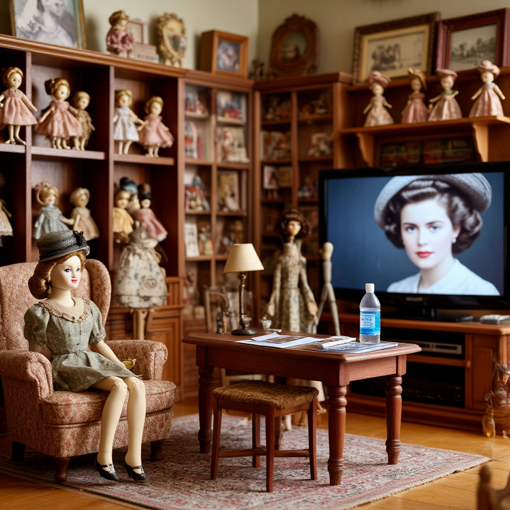 В комнате на заднем плане – полки-стеллажи с сидящими и стоящими куклами, между куклами – шкатулка, фото в рамках, одно фото – старое, портрет женщины с шиньоном. Раскройный стол, большой ящик, набитый мешками, пластиковые короба. Тут же рядом со столом – манекен в шляпке.