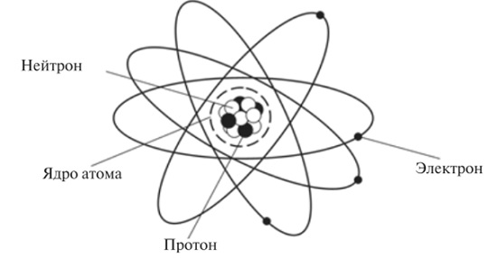 Все атомы состоят (образованы) из отрицательно заряженных электронов и положительно заряженного ядра вокруг которого эти электроны распределяются. Ядро состоит из протонов и нейтронов - ну распадается при делении на эти частицы.