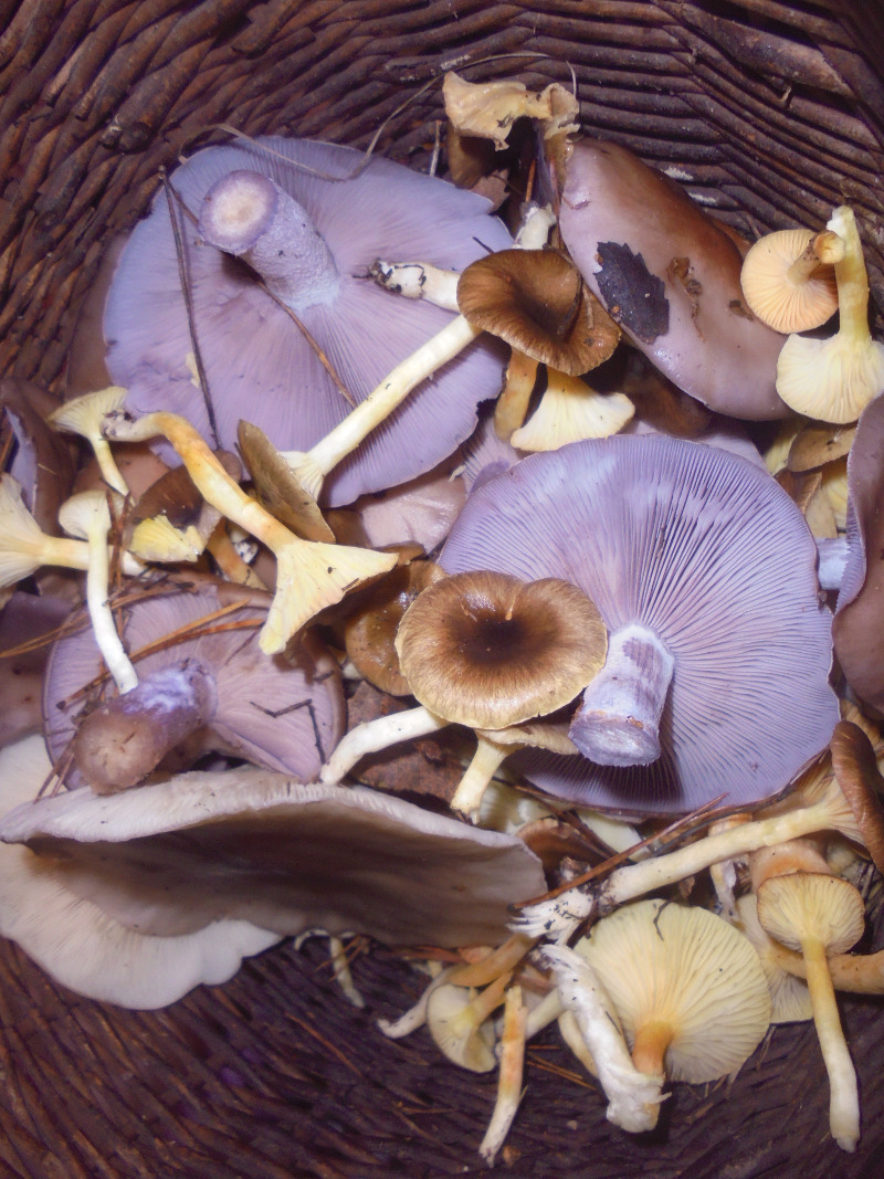 Но что это? В канавке между старыми соснами во влажных листьях берёзы лежали вырванные с корнем и раскрошенные хорошие тела... фиолетовых рядовок! А неподалёку, у соседних сосен чуть ли ни ползком грибница срезала мышат.