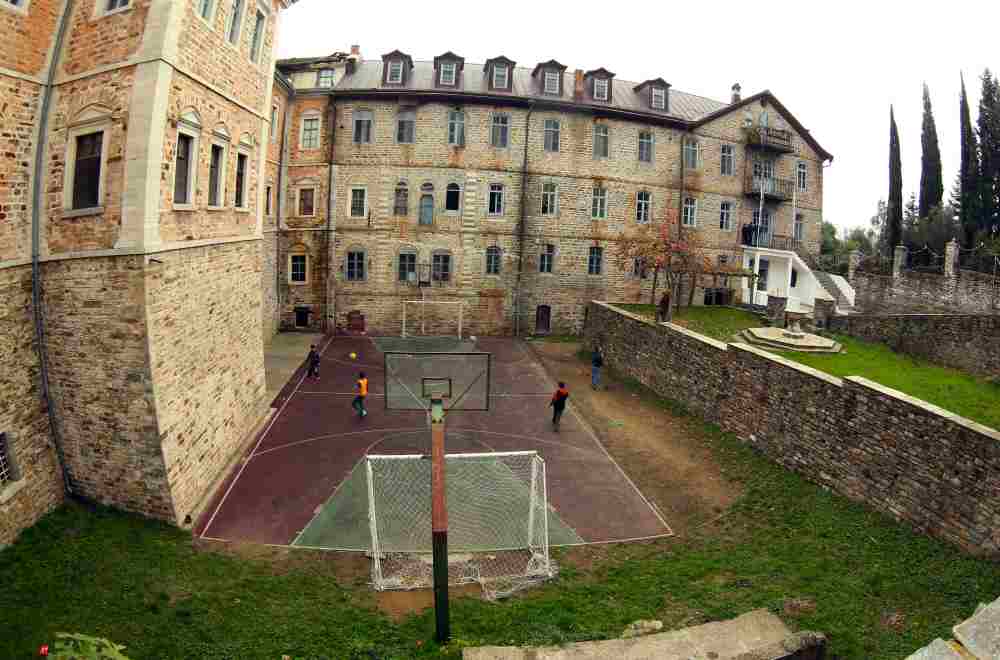 Святая гора Афон. Баскетбольная площадка?... Вот не ожидал увидеть. Надо бы спрятать эту фотографию от наших СМИ, а то такого понапридумывают про афонских монахов. А всё объясняется просто. На Афоне действует школа для мальчиков. Для ребят и построили эту спортивную площадку (сама школа видна на заднем плане).