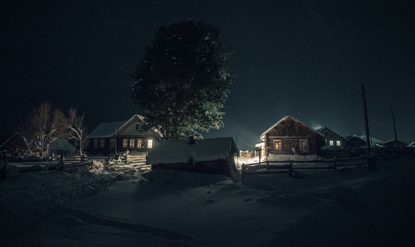 Безлунная ночь. Заманчиво светятся во мраке ночи огоньки в окнах домов на окраине села, бросая на снег яркие полосы света. Теплом и уютом веет от этих манящих огней в домах на окраине в морозную ночь. За ними расстилается только покрытое глубокими сугробами заснеженное пространство, утопающее во мраке ночи. Яркие снопы света от мощных фонарей уличного освещения бросают свой светящийся лучистый отблеск на ослепительно сверкающий в их лучах снег и высокое дерево, подсвечивая его удивительную густую зеленеющую крону, такую необычную в эту пору, и даже трудно определить что это за вечнозелёная красавица. Создавая необычную картину зимней ночи, наполняя душу какими-то тёплыми чувствами. Что-то неуловимое и волнующее видится в этом пейзаже, невольно погружая в какие-то смутные, милые сердцу и греющие душу воспоминания, напоминающие что-то из прошлого или из далёкого детства.