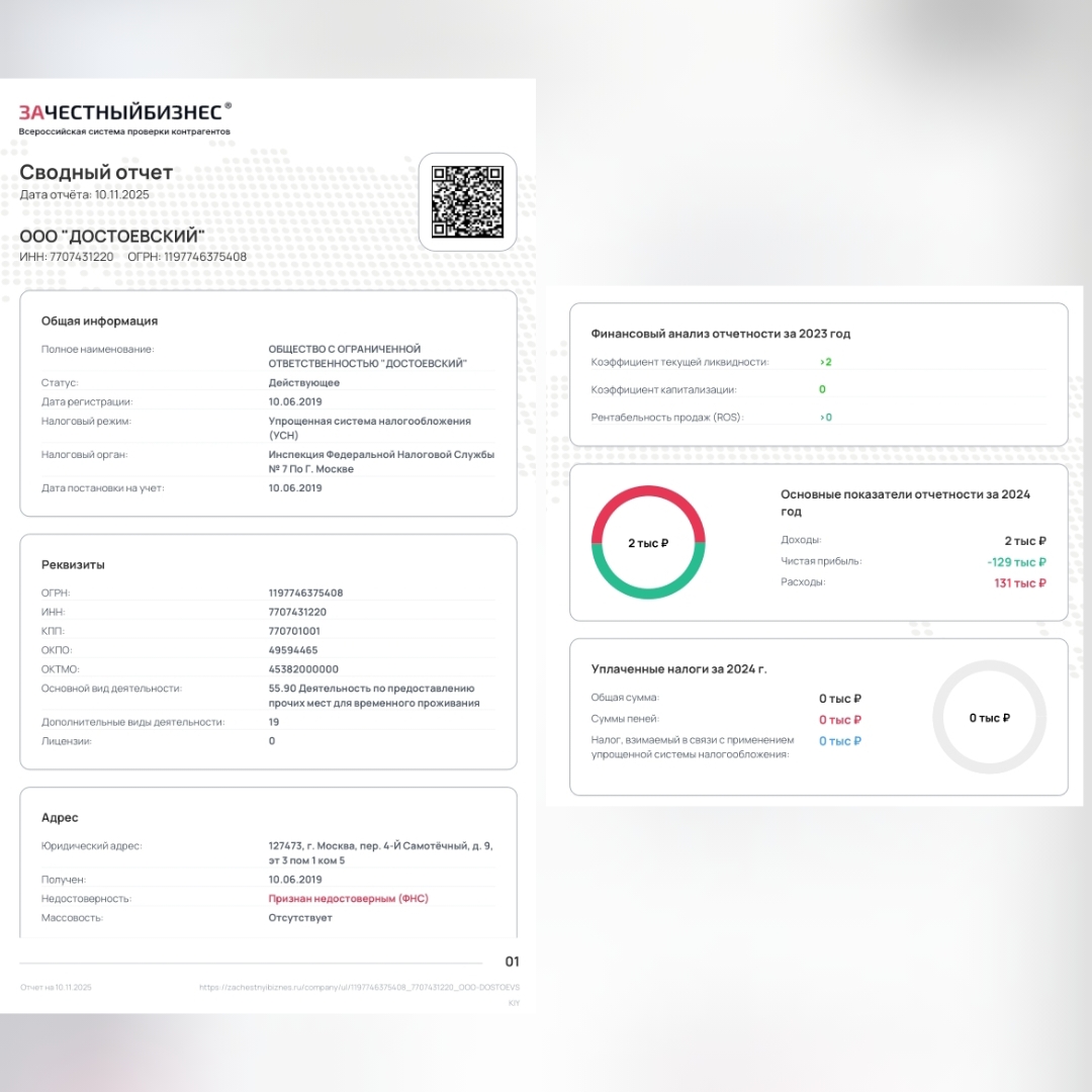При этом, в данных бухгалтерской отчётности за 2024 год указан общий доход в размере всего двух тысяч рублей и отрицательная чистая прибыль.
