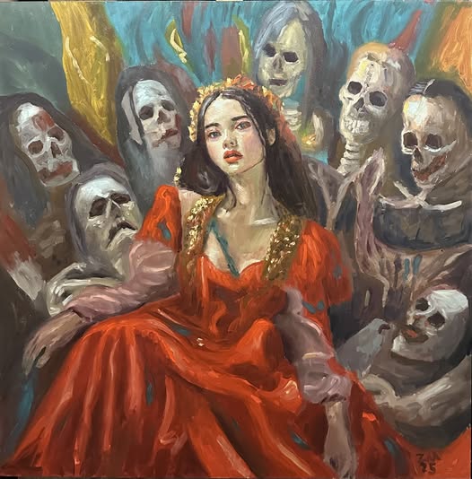 У меня другое восприятие картины. Если бы скелеты стояли за ней и смотрели вперед, то могло бы быть ощущение, что они предки- ее сила, они на ее стороне. А на картине они жадно и тревожно смотрят на девушку, это рождает неприятное чувство.