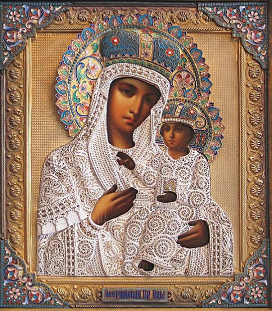 Озерянская икона была украшена дорогой ризой из червонного золота старинной работы, написана на холсте древним малороссийским письмом.