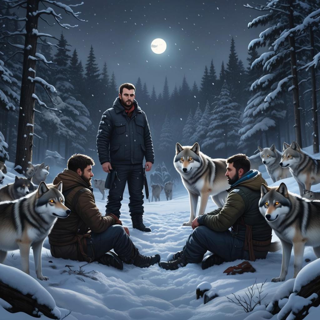Люди замерли, вслушиваясь в мелодичный и одновременно пугающий аккорд звуков. Волки не отступали, их голоса словно заполняли пространство, напоминая о первобытной силе природы.