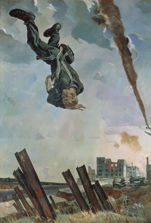 Так называется картина, которую в далеком 1943 году написал замечательный художник Александр Дейнека. Сюжет у картины необычный. Падает сбитый немецкий самолет, а его пилот головой вниз стремительно мчится к земле! То ли парашют не раскрылся, то ли прыгать из горящего самолета было поздно? Благодаря необычному сюжету, динамичной, лаконичной композиции и тональному контрасту картина получилась очень зрелищная и эмоциональная.