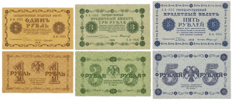 Иллюстрация: 1918. Государственные кредитные билеты образца 1918 года номиналом 1 (112 х 66 мм), 3 (118 х 70 мм) и 5 (125 х 76 мм) рублей. На банкнотах стояла подпись первого Главного комиссара Народного банка РСФСР Георгия Леонидовича Пятакова. Он к этому времени уже воевал на Украине, а денежной политикой в РСФСР заведовал Народный комиссариат финансов (Наркомфин), во главе с Николаем Николаевичем Крестинским. Но в народе эти деньги прозвали «пятаковками». Другое название купюр – «пензенки» связано с тем, что большая часть банкнот печаталось в Пензе. Именно туда в марте 1918 года эвакуировали часть работников и оборудование Экспедиции заготовления государственных бумаг (будущий Гознак). «Пятаковки» печатались и в Москве, и на фабрике в Перми.