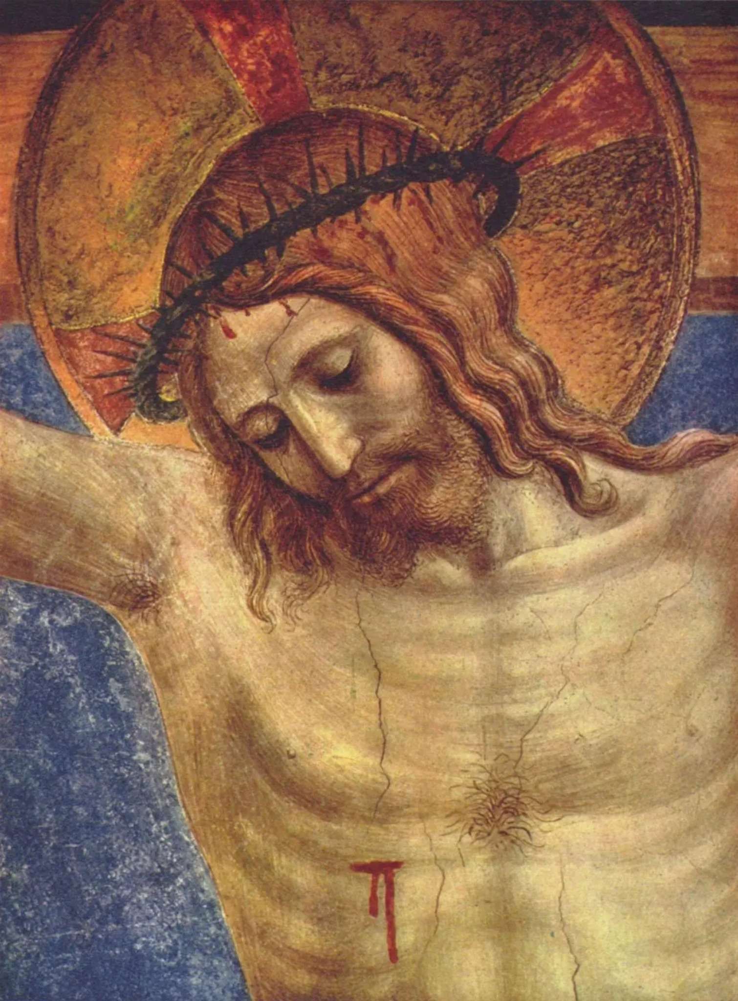 Тело Христа моделировано более объемно, чем в композиции из Фьезоле, использованы также отдельные приемы натуралистической передачи форм. Правильный прямоугольный формат фрески был нарушен в XVII веке добавлением мраморного обрамления.