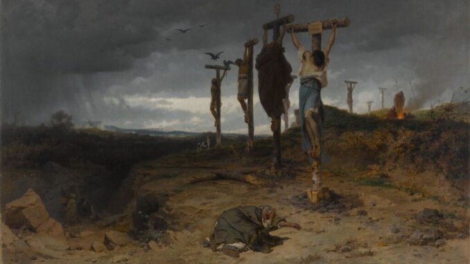 Мастер изобразил стоящие вдоль дороги кресты в форме буквы «Т» (crux patibulata), к которым пригвоздили людей. Художник сумел грамотно совместить каноны академической живописи и приёмы реализма. Рассматривая детали, мы проникаемся духом трагедии. Плачущая от горя женщина, уходящие по тропинке палачи, греющиеся у костра воины-охранники, воющая собака, черные птицы, надвигающаяся дождевая туча дополняют мрачный сюжет «проклятого поля» и усиливают гнетущую атмосферу произведения…