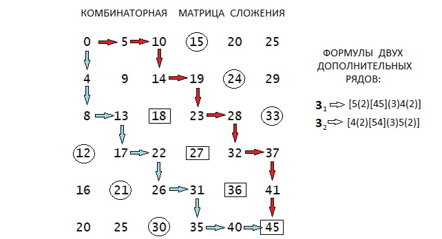 Ответ автора оказался довольно простым. Допустим нужно создать самые различные кладки из блоков 3х5 и 3х4. Чтобы осуществить сказанное, необходимо иметь всегда минимум четыре ряда. Два ряда довольно просты: 5[3(L/3)] и 4[3(L/3)]. Остается создать еще два ряда, у которых внутренние швы не оказывались числами, кратными трём. Это можно осуществить, если построить Комбинаторную Матрицу Сложения или КМС. Она показана в иллюстрации. Любая строка её - арифметическая прогрессия с шагом 5, а любой столбец - арифметическая прогрессия с шагом 4. Ясно, что длина ряда L должна быть как раз кратной числу 3. Координаты желаемой длины L окаймляем прямоугольниками, а промежуточные числа, кратные трем окаймляем кружочками. Нам нужно выбрать два разных пути от нуля до L. Хорошо видно, что значения L - суть арифметическая прогрессия с шагом 9. Допустим что L=45. Эти пути ведем по стрелкам. Первый путь - по красным стрелкам, второй путь - по голубям стрелкам. Справа показываем их в виде формул. Понять логику этих формул довольно легко, сравнивая записи с числами по стрелкам КМС. Важно, чтобы в данных двух цепочках чисел отсутствовали одинаковые (кроме нуля и L). После этого можно заниматься вопросом формирования торцов рядов, которые образуют ширину стенки В. Об этом разговор будет в следующей части, что по ссылке: