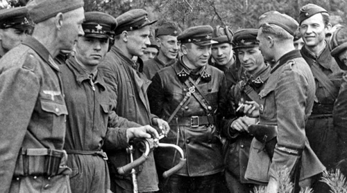 на фото:"Дружба, скрепленная кровью". Советские и германские солдаты делятся впечатлениями от войны с Польшей. Кстати, один из советских воинов уже успел «прибарахлиться» велосипедом. Массовое мародерство советских освободителей в Польше помнят до сих пор.