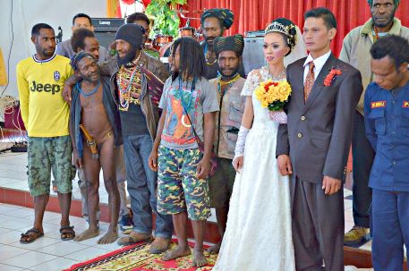 Потом подтянулись окультуренные папуасские семьи, а в конце церемонии священник предложил и нам запечатлеться на свадебной фотографии. Как-то сразу растерялись, а потом опомнились, и решив, что хоть мы и не в свадебных нарядах, а всё не хуже папуасов, и вышли ко всеобщей радости на «большую сцену» с купюрой в $50, отдав предварительно фотокамеру профессионалам. При виде нас народ развеселился и охотно присоединялся для съёмки. Так мы стали звёздами!