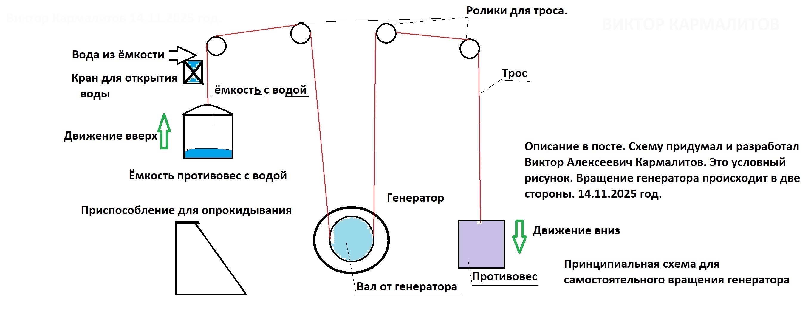 Принцип вращения прост: Противовесы. Один чисто груз. Второй, ёмкость для жидкости (воды). Первый противовес груз внизу. Второй ёмкость для воды поднимается вверх и в верхней точке открывает запорный кран для подачи воды. Вода наливается в ёмкость! Ёмкость становится тяжелее противовеса и устремляется вниз. Кран закрывается. В своём движении ёмкость и противовес связаны тросом, который всё время вращает вал генератора. Емкость с водой достигает нижней точки это приспособление для опрокидывания (ранее практиковал клапана)... . Ёмкость опрокидывается и часть воды выливается ( в бочку, не принципиально). Ёмкость становится легче и под действием противовеса (груза), устремляется снова вверх.