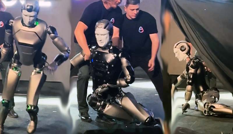 Презентация нашего перспективного робота-гуманоида проходила в московском бизнес-центре на Якиманке. Присутствующие журналисты сообщают, что вначале зачем-то танцевала балерина, потом босоногие танцоры, а уже после под музыку из культового американского боевика 1976 года "Рокки" появился презентуемый робот-андроид. Сделав несколько неуверенных шагов, он попытался помахать верхними конечностями, но завалился налево.