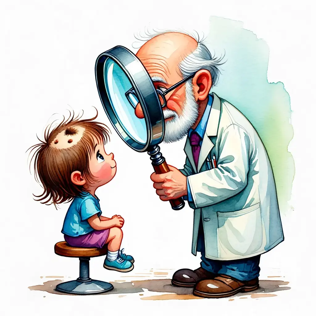 Он усадил Лену на стул с вращающейся табуреткой, достал огромную блестящую лупу и стал изучать её голову, издавая учёные звуки: "Хм!", "Ага!" и "Вот оно что!".
