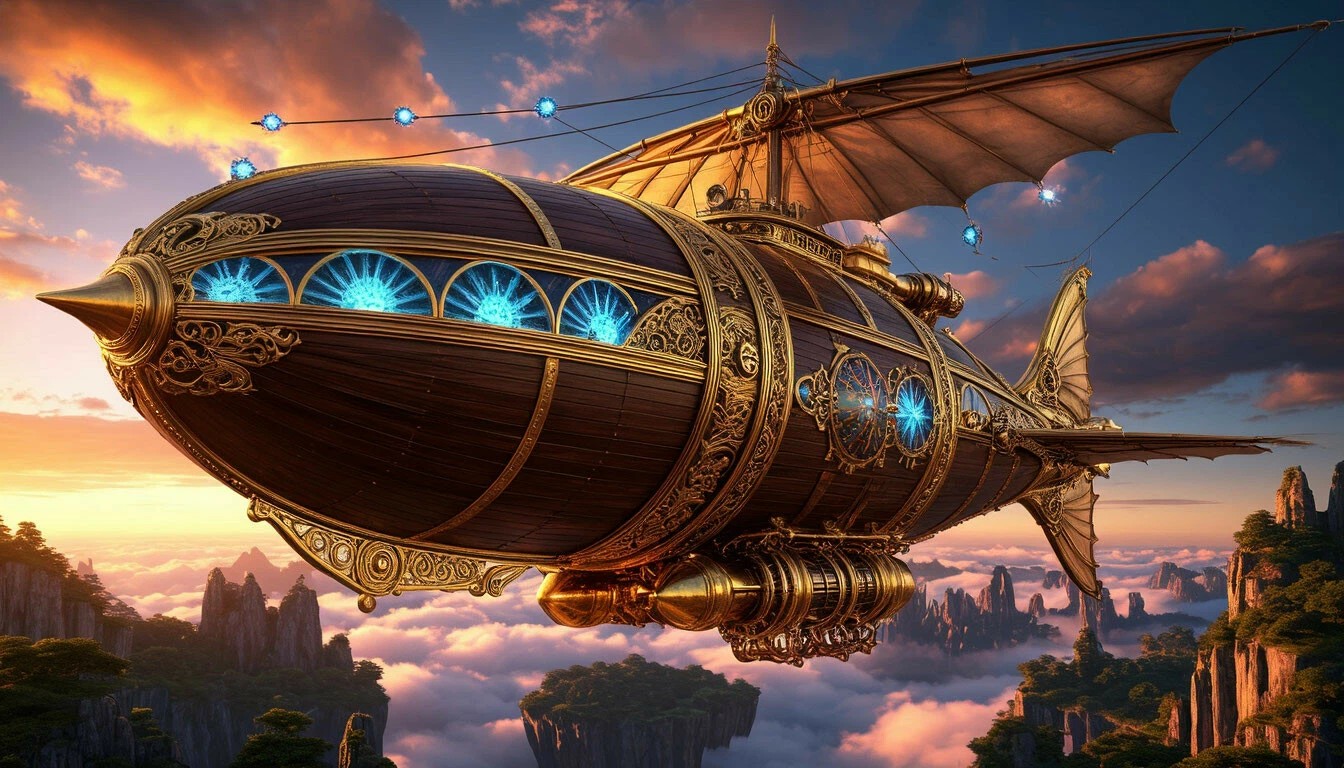 Аппарат больше походил на творение гениального часовщика, чем на обычное судно. Его каркас был собран из тёмного, прочного дерева и отполированной до зеркального блеска латуни. Каждый дюйм поверхности покрывала тончайшая золотая филигрань, сплетаясь в замысловатые узоры. А широкие, похожие на плавники крылья-паруса дополняли фантастическую картину. Это было завораживающее зрелище.