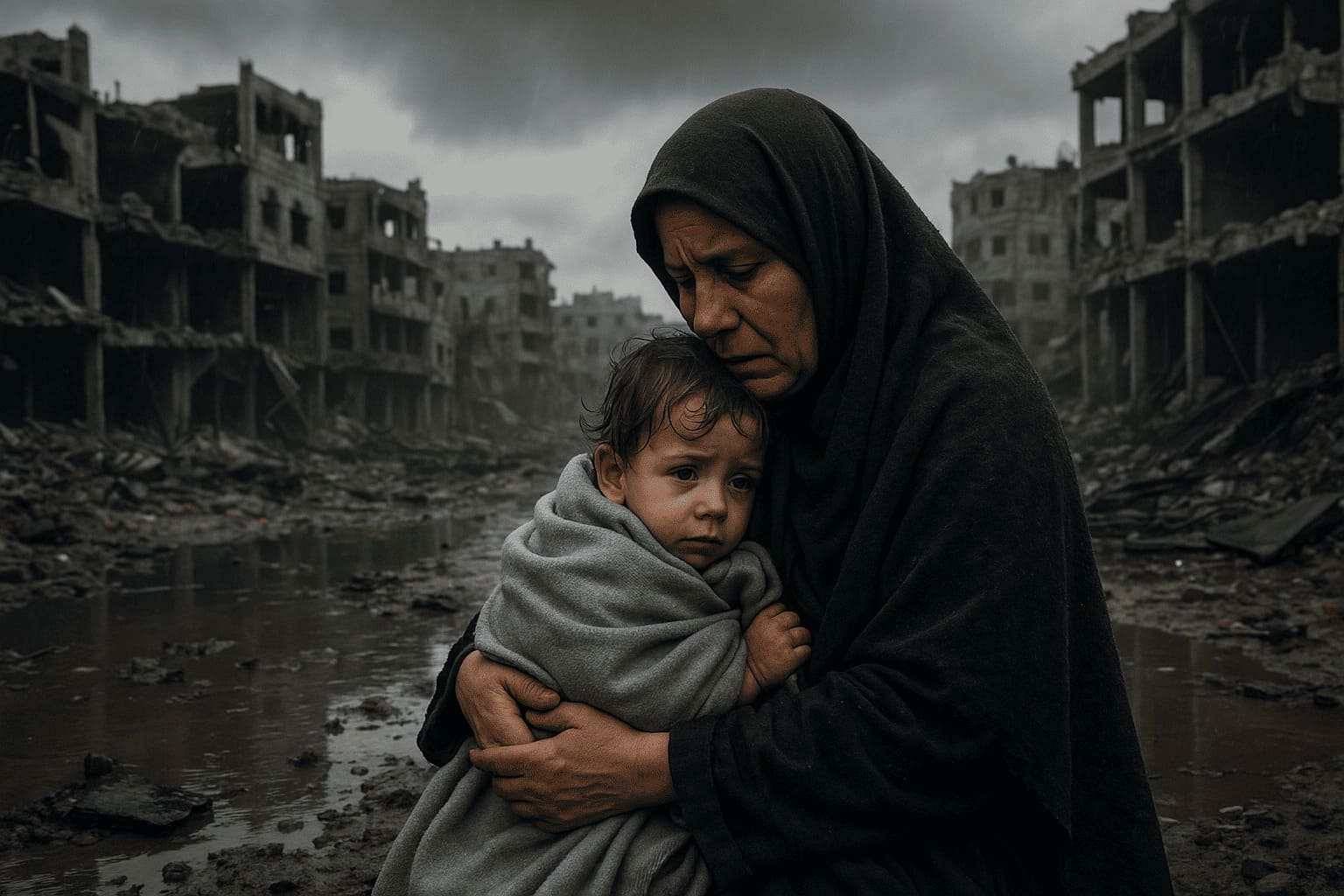 Визуальный кадр: Тёмное небо над разбитым жилым кварталом в Газе. Женщина у льда воды подкапалого дождя, пытается укрыть ребёнка.