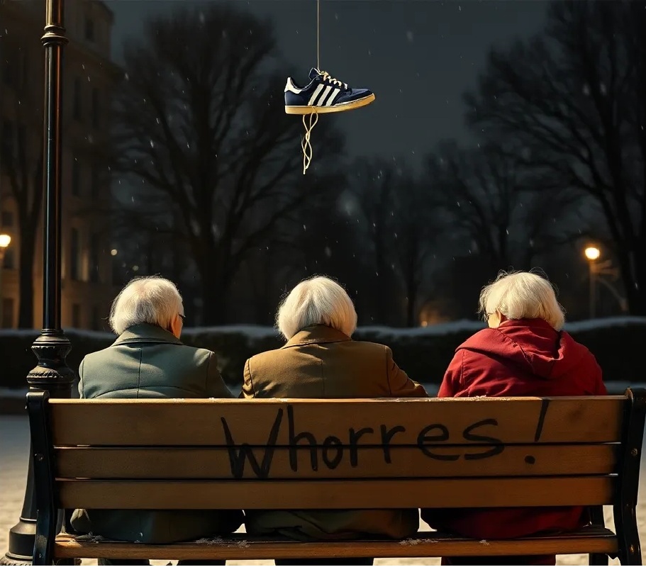 И вот в такой прекрасной предпраздничной атмосфере, третьего дня, хищным взором в сотый раз оглядывая всё кругом, в закрытом дворе, около дома 24 на улице «Сантехников», посреди серых исполинов многоквартирных многоэтажек, на старой, не просто так расписанной непотребствами лавочке, возле чуть тлеющего фонаря с бог знает зачем повешанным на него, одиноким кросовком фирмы «Абибас», встретились две старушки: