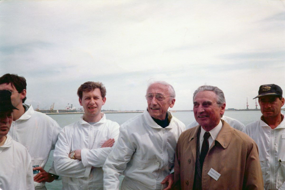 В центре изобретатель турбопаруса академик Люсьен Малавар и капитан Кусто. Рядом с Жаком-Ивом Кусто специальный корреспондент Московского радио Владимир Кривошеев. Перед отплытием турбопарусника «Алкиона» из Ла-Рошели. 13 мая 1985 года.