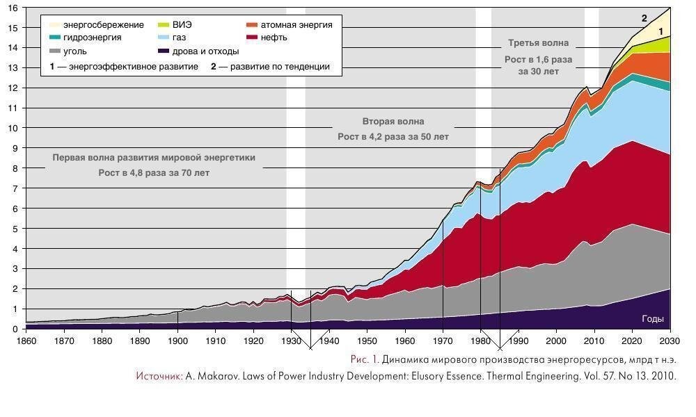 Сфера же его распространена по времени пережитых мною отрезков из двадцатого и двадцать первого веков. Но уж веков, действительно специфических. Не вдаваясь здесь в весь необозримый массив их деталей, учтённых во множественных классификациях общего процесса эволюции общества, возьму хотя бы динамику мирового производства энергоресурсов.