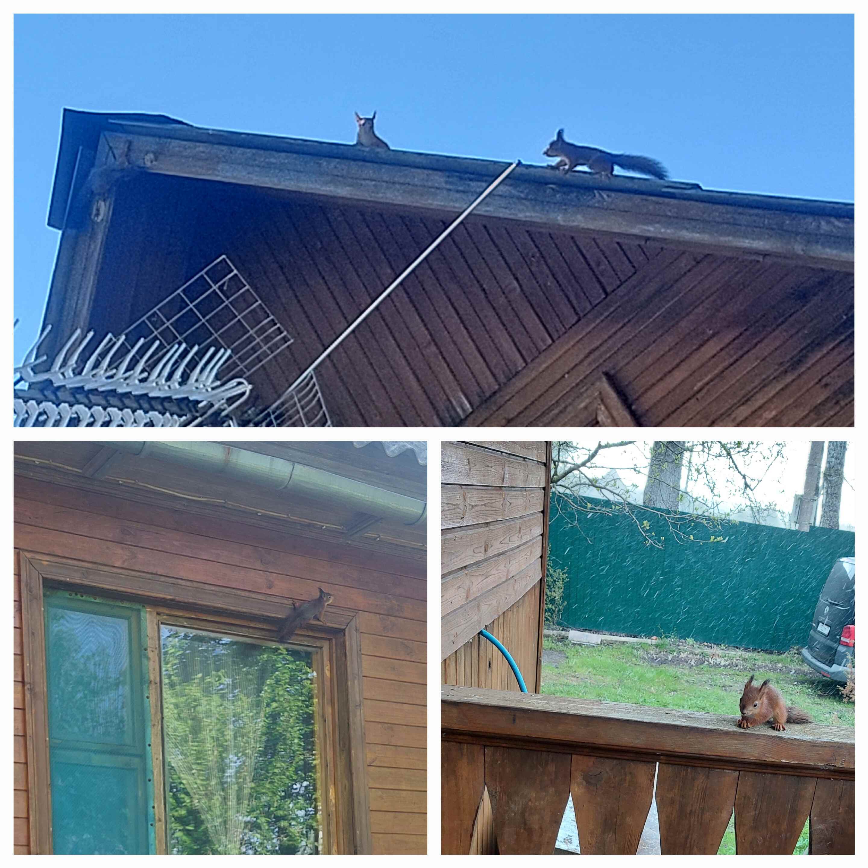 Увидела малыша — и рванула к нему. Тот залез на дерево, она осталась внизу. Стоят, смотрят друг на друга. А на крыше беличья семья мечется и переживает.