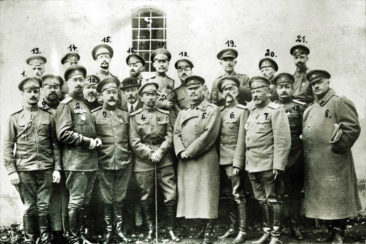Иллюстрация: Сентябрь 1917 г. Группа арестованных Временных правительством генералов и офицеров во главе с Корниловым в период «быховского заточения». Всего около 30 офицеров. Среди них: Л. Г. Корнилов. А. И. Деникин. Г. М. Ванновский. И. Г. Эрдели. Ф. Эльснер. А. С. Лукомский. В. Н. Кисляков. И. П. Романовский. С. Л. Марков. М. И. Орлов. Л. Н. Новосильцев. В. М. Пронин. И. Г. Соотс. С. Н. Ряснянский. В. Е. Роженко. А. П. Брагин. И. А. Родионов. Г. Л. Чунихин. В. В. Клецанда. прапорщик С. Ф. Никитин. Возможно, среди них был генерал-майор Николай Кириллович Копылов, окружной интендант Варшавского военного округа.