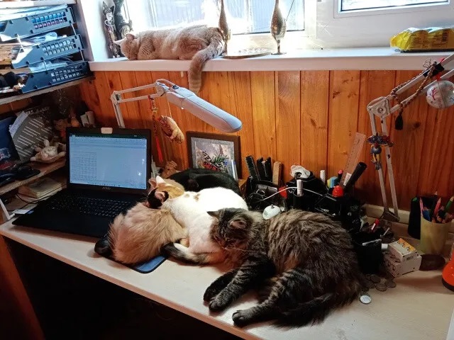 Помогают - Пиппа, Бусинка и котики ("последние" - методом трансляции котячьих снов из утренней дремы - иллюстрация прилагается).