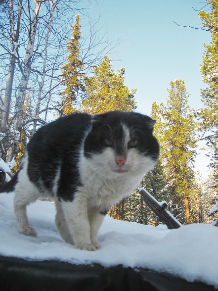 2015 год, кот Седой в тайге Западной Сибири, на севере Югра, на оснёвке, на крыше зимовья. Осень.