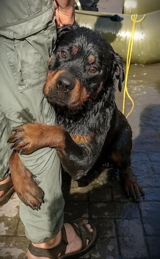 ...Промокший ротвейлер, дрожащий и напуганный, прицепился к моей ноге, как будто это последнее безопасное место в мире.
