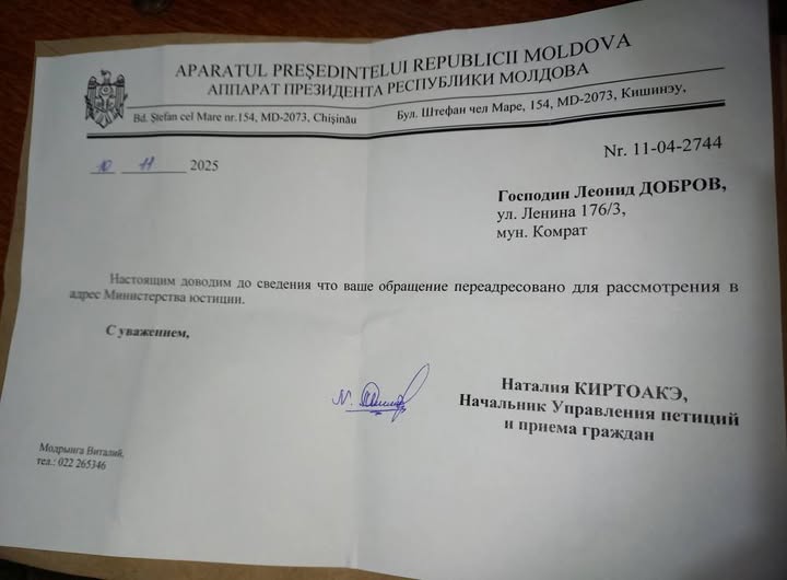 Не поверите, но на наш запрос в адрес Майи Санду уже получен ответ даже на русском языке (в последние 25 лет такого еще не было!) от Наталии Киртоакэ, начальника управления петиций и приема граждан, хотя исполнил данную петицию другой чиновник - Модрынга Виталий.