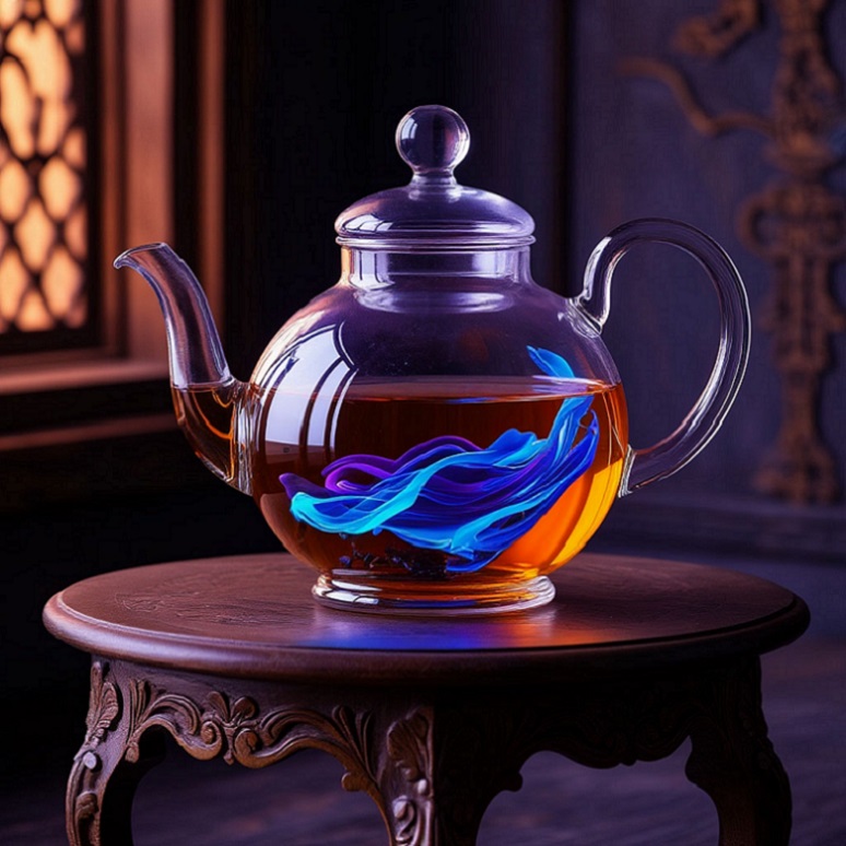 Чаинки медленно опускаются на дно, распускаясь цветом в прозрачной сфере чайника.