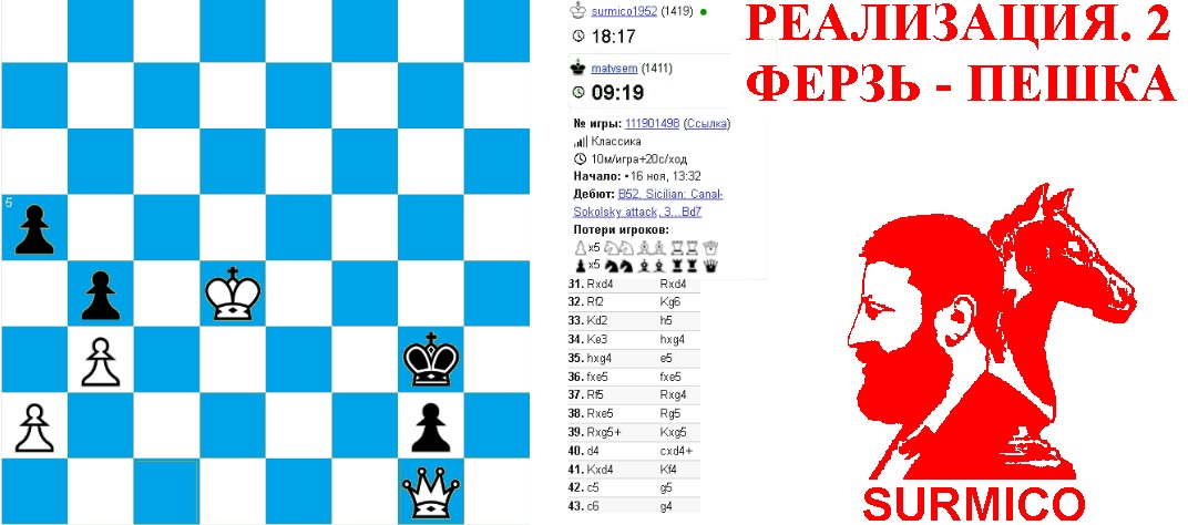 Ход белых ферзём на поле перед пешкой – это профессиональный ход старого композитора. Пункт первый: король не может сам атаковать ферзя и не в состоянии прогнать негодника с этого чудесного места. Пункт второй – пешка намертво приросла «попой к стулу». Теперь белый король стремительно бежит к паре чёрных пешек на фланге и уничтожает их «ничтоже сумняшеся». А затем… а затем ферзь жрёт пешку, которую он так успешно притормозил! И теперь, если флаг рухнет это будет как минимум ничья! Белые не проиграют по времени партию. А если повезет, то успеют провести нового ферзя и заматовать упорного партнёра.