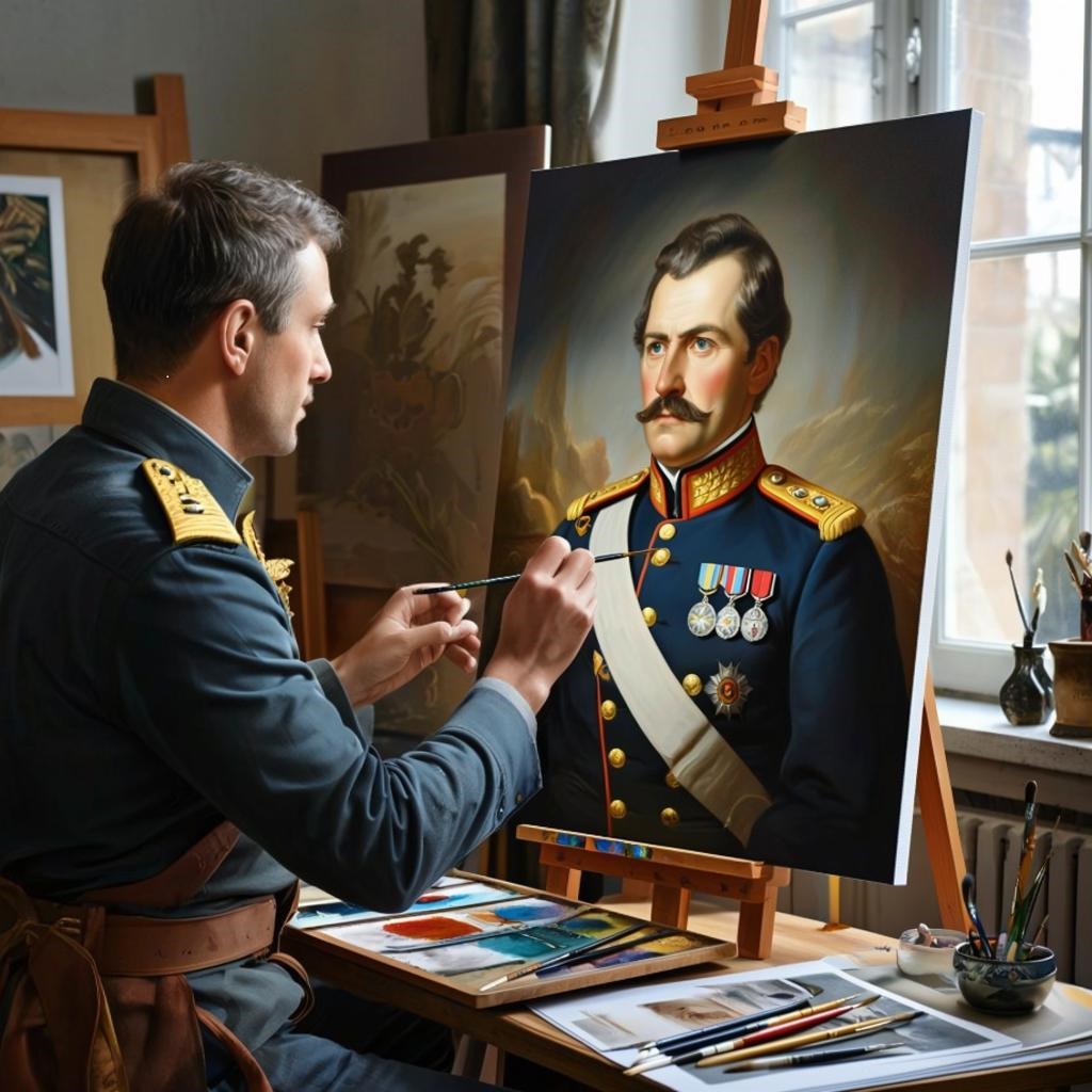 Дверь была приоткрыта, и было слышно, что кто-то тихо пел. Не решившись постучать, но набравшись наглости, я вошёл. Тут же замер. Это была мастерская художника. Картины стояли на полу, висели на стене. В ярко освещённом центре мастерской стоял хозяин — художник. Он тщательно прорисовывал каждую деталь, уделяя особое внимание тому, как свет отражается от металлических эполет на плечах изображённого им полководца.