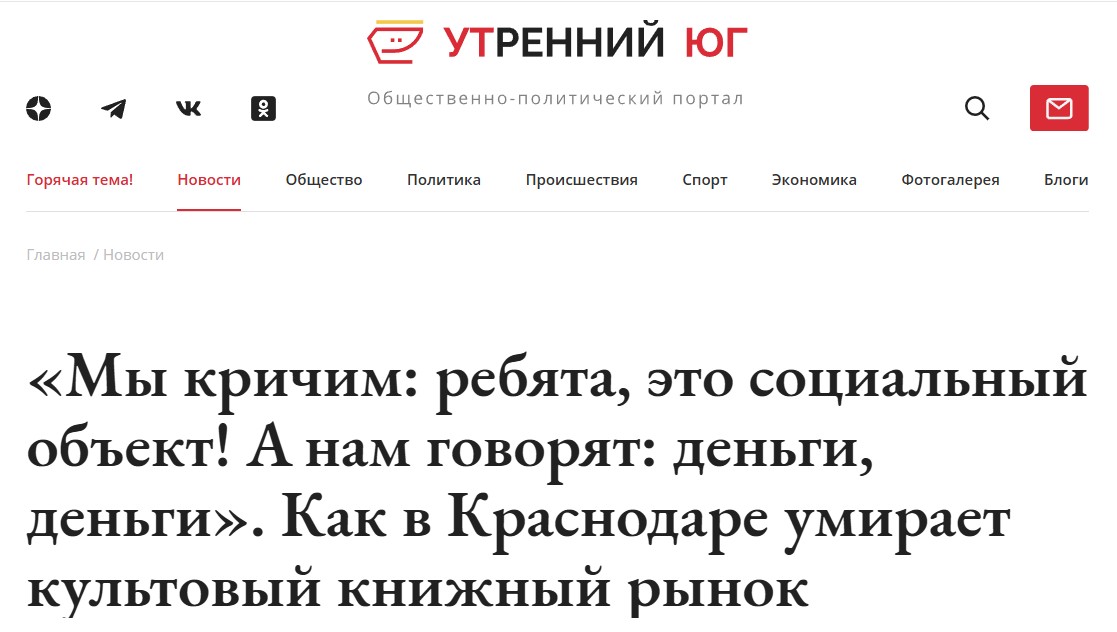 18 ноября я ознакомился с материалом под названием «Мы кричим: ребята, это социальный объект! А нам говорят: деньги, деньги». Как в Краснодаре умирает культовый книжный рынок». К сожалению, по моему мнению, он абсолютно необъективен и не эффективен.