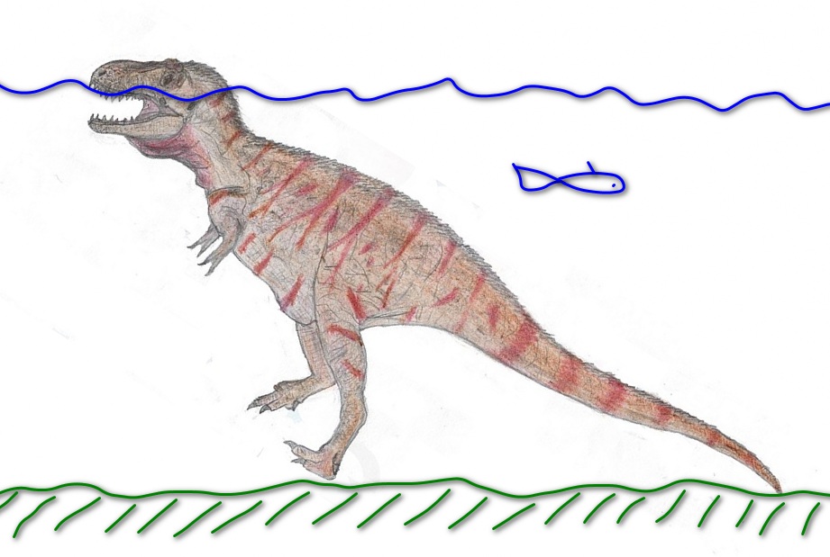 4. Тираннозавр ростом 5 м мог двигаться в воде (бежать по дну, топляку и т.п.) неограниченно долго, разгоняться на мелководье до приблизительно 5..10..14 м/c, быть там опасным хищником, а также мог совершать броски за жертвой с мелководья на берег на большое расстояние, не менее чем приблизительно 3,5 м, а на глубине гораздо больше.