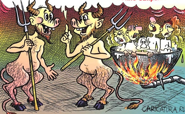 — Слушай, у нас сера по талонам, котлы на холостом ходу, а грешники бунтуют! Что делать?!