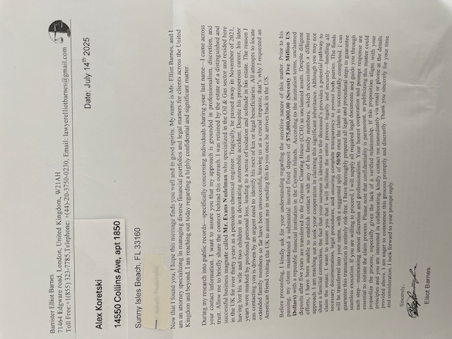 Позвольте мне вкратце рассказать о ситуации, стоящей за этим обращением. По роду своей деятельности, в настоящее время я занимаюсь решением имущественных вопросов раннее известного в нашей стране, успешного бизнес-магната господина Эванса Корецкого, который трудился в нефтегазовом секторе промышленности более тридцати лет и проживал в Лондоне. К сожалению британской общественности, в ноябре 2022 года он скончался от горя и незаживающих ран, потеряв жену и единственного ребёнка в фатальной для всех членов семейства автомобильной катастрофе. Последний период его жизни был отмечен глубокими личными переживаниями и потерями, что привело к нерешённой ситуации с его наследством. Завещание отсутствует! Все мои попытки найти законных бенефициаров Эванса Корецкого в Великобритании не увенчались успехом, что поставило меня в полный тупик. В ходе поисков в сети общедоступной информации об его однофамильцах, я наткнулся на контакты Алекса Корецкого, переводчика, проживающего в Майами. Поэтому я решил отправить вам это письмо.